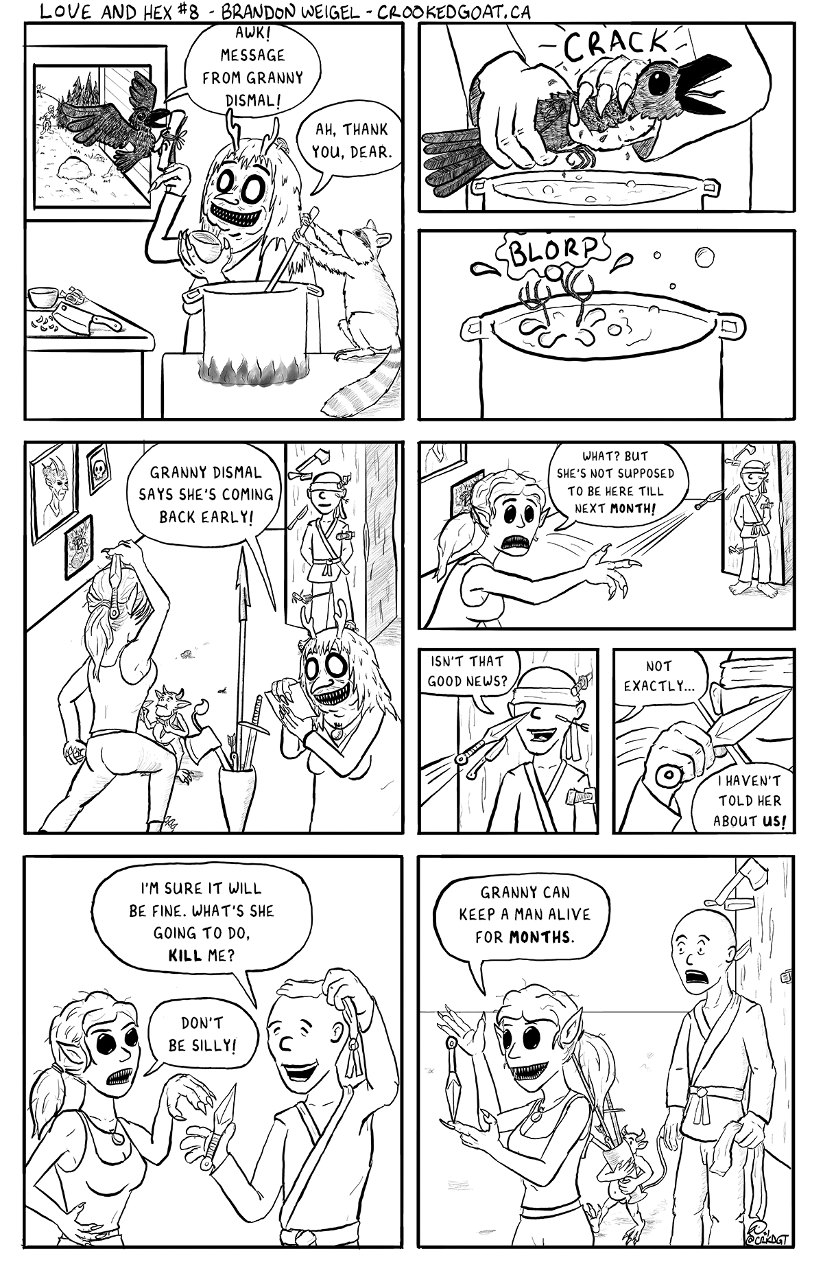 Transcript(A crow clutching a scroll in its talons enters the house through the window, as Nanny Muk stands in front of a stove. A racoon stirs her cooking pot.) Crow: Awk! Message from Granny Dismal! Nanny: h, thank you, dear. (Nanny breaks the crow's neck and throws it into the pot.) (Kayra is throwing knives, axes, and other sharp objects at Singing Cricket, who is blindfolded. An imp stands by with throwing stars, next to an urn full of weapons. Nanny reads the message.) Nanny: Granny Dismal says she's coming back early! (Kayra looks upset, turning toward Nanny. Distracted, she throws her knife directly at Singing Cricket's face.) Kayra: What? She's not supposed to be here till next month! (Knife approaches Singing Cricket's face. He does not react.) Singing Cricket: Isn't that good news? (With lightning speed and precision, Singing Cricket's hand snatches the knife out of the air.) Kayra (off-panel): Not exactly... I haven't told her about us! (Singing Cricket removes his blindfold, and passes the knife back to Kayra.) Singing Cricket, laughing: I'm sure it will be fine. What's she going to do, kill me? Kayra, annoyed: Don't be silly! (Kayra walks away, pursued by the imp carrying the urn full of weapons. She balances the knife on her finger. Singing Cricket looks horrified.) Kayra: Granny can keep a man alive for months. |