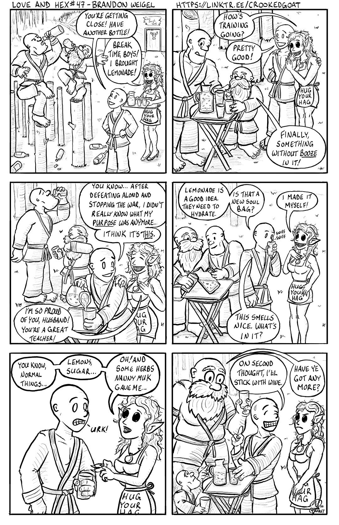 TranscriptSinging Cricket's new students, a large musclebound human and a thick-bearded dwarf, both dressed in martial arts training uniforms with bald or shaved scalps, balance on one foot atop posts while drinking from wine bottles. More empty bottles are scattered on the ground. Singing Cricket gazes up approvingly at them. SC: "You're getting close! Have another bottle!" Kayra, in her Hug Your Hag apron, carries a tray of lemonade with three glasses. K: "Break time, boys! I brought lemonade!" Kayra and Singing Cricket hold each other affectionately while watching the students get their lemonade. K: "How's training going?" SC: "Pretty good!" Dwarf: "Finally, something without BOOZE in it!" The students drink, evidently enjoying it. Singing Cricket pours a glass for himself. SC: "You know... after defeating Alond and stopping the war, I didn't really know what my PURPOSE was anymore... I think it's THIS." K: "I'm so proud of you, husband! You're a great teacher!" The students go back for more lemonade. For some reason, the dwarf and the big guy are now the same height. SC: "Lemonade is a good idea. They need to hydrate." SC: "Is that a new soul bag?" K: "I made it myself!" Singing Cricket sniffs his glass. SC: "This smells nice. What's in it?" Kayra looks up, thinking. K: "You know, normal things... Lemons, sugar... Oh! And some herbs Nanny Muk gave me.." Singing Cricket grits his teeth with an "URK!" Singing Cricket, grinning and perspiring, puts his glass back on the table. Kayra glares at him. SC: "On second thought, I'll stick with wine." The dwarf, now nearly twice as big as Singing Cricket, looms over him. The musclebound student, as short of the table, strains for the lemonade pitcher. Dwarf: "Have ye got any more?" |