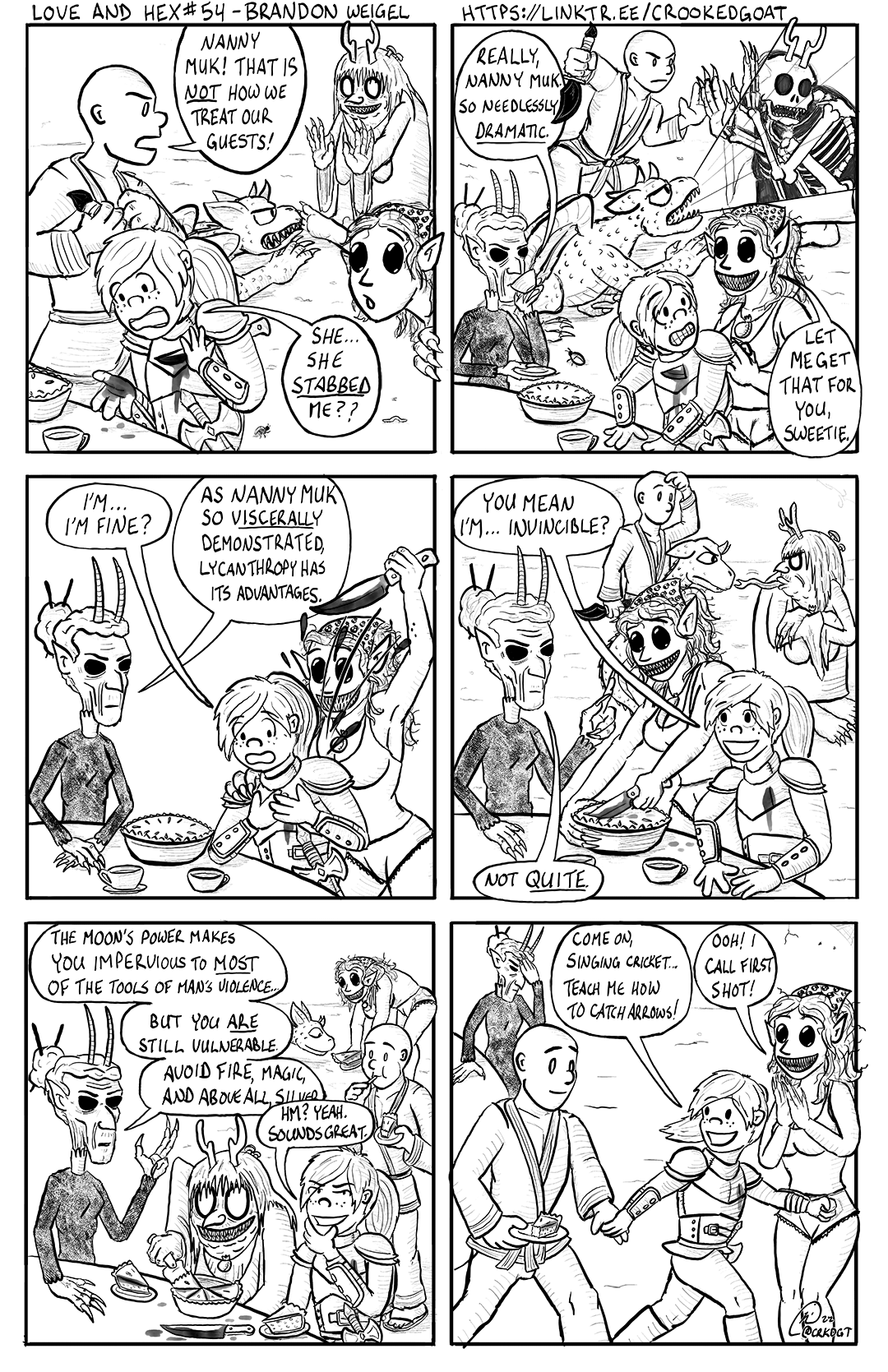 Granny: "The moon's power makes you impervious to MOST of the tools of man's violence... But you ARE still vulnerable. Avoid fire, magic, and above all, silver." Tamilda, is thinking about something else and does not seem to be paying attention to that warning. "Hmm? Sounds great."