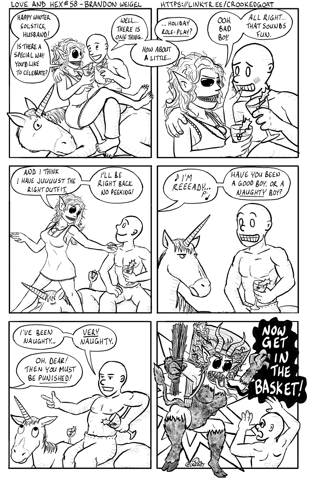 From off-panel, Kayra calls, "I'm reeeady... Have you been a good boy, or a NAUGHTY boy?" Singing Cricket grins excitedly, while the unicorn looks at him with annoyance.