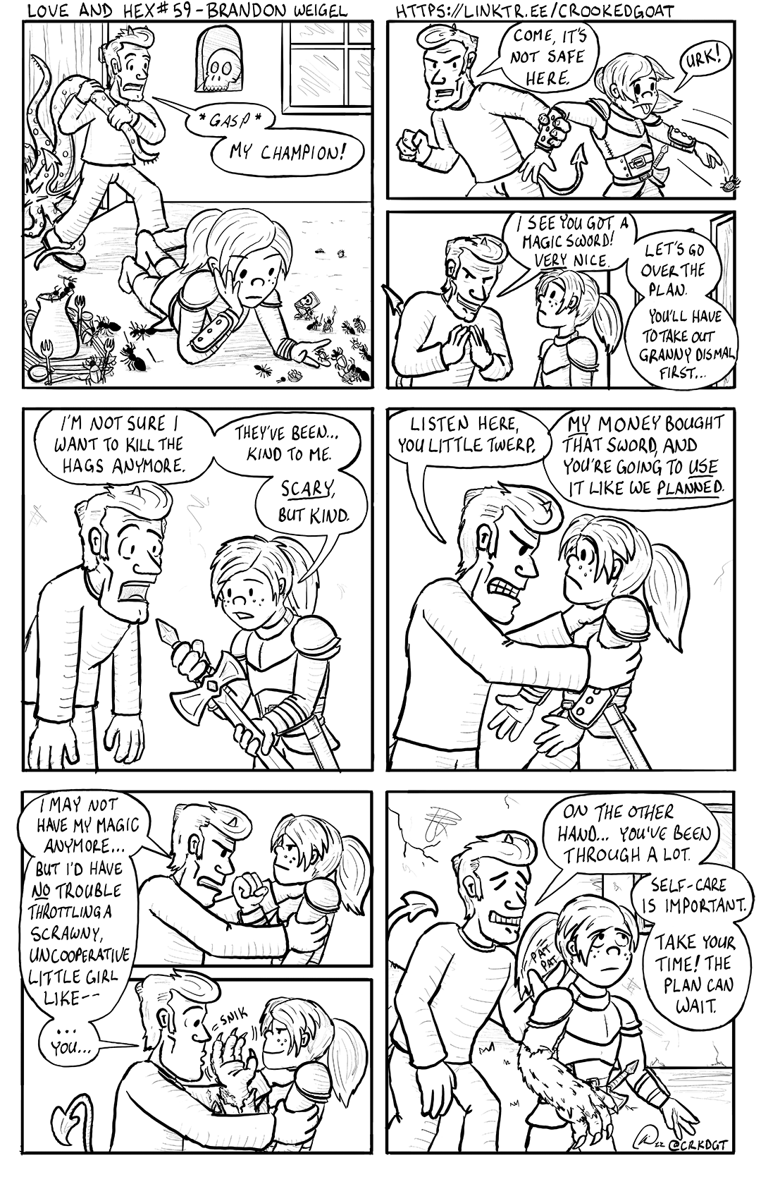 An introspective Tamilda lies on the floor, watching the ants and beetles defend themselves against the zombie bugs. She allows a beetle to crawl onto her hand. Alond enters the house, dragging the body of some horrific tentacled thing. He gasps upon seeing Tamilda. "My champion!"