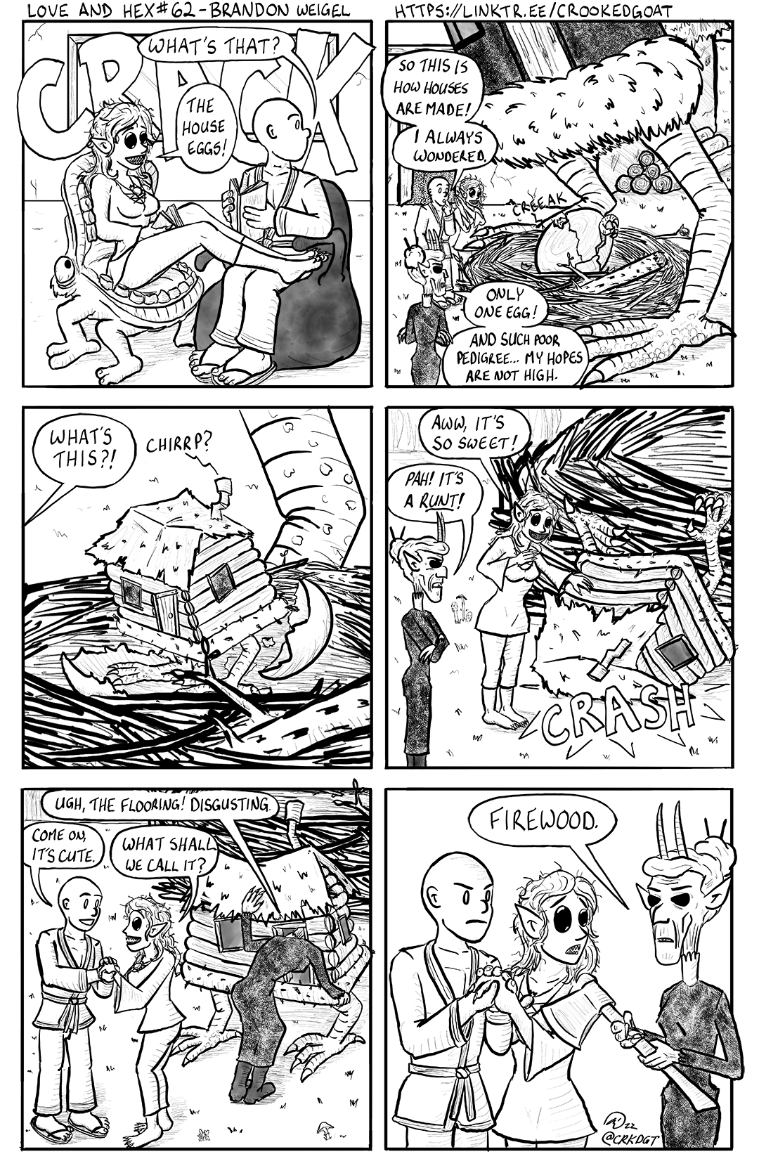 - The egg hatches. A tiny log cabin, with a crooked thatched roof, crooked tin chimney, crooked door and window frames, and little pinfeathers sticking out of its base, struggles to stand on its oversized bird feet.