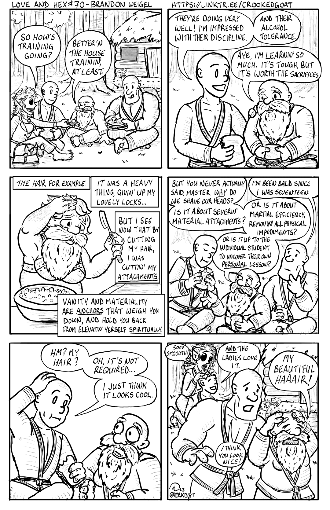 The dwarf continues: "But you hever actually said, master. WHY do we shave our heads?" The big guy strokes his chin thoughtfully and interjects, "I've been bald since I was seventeen." The dwarf, ignoring this, continues. "Is it about severin' our material attachments? Or is it about martial efficiency, removin' all physical impediments? Or is it up to the individual student to uncover their own PERSONAL lesson?"