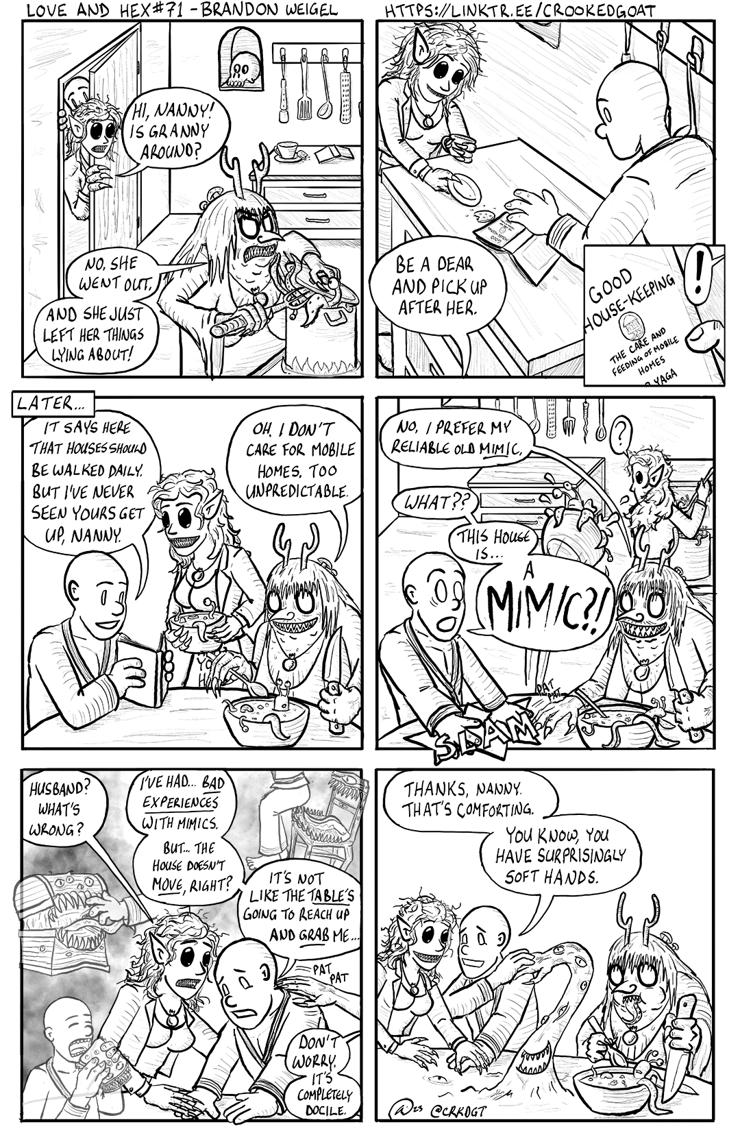 "I've had... Bad experiecnes with mimics," replies Singing Cricket. Faint images surround him, his memories of those bad experiences: sitting down on the pointy-toothed maw of a mimic chair, reaching a hand into the mouth of a hungry mimic chest, taking a bite into a mimic sandwich... "But... the house doesn't MOVE, right? It's not like the TABLE'S going to reach up and GRAB me." From off-panel, a hand reaches over and pats him on the shoulder. Nanny Muk says, "Don't worry. It's completely docile."