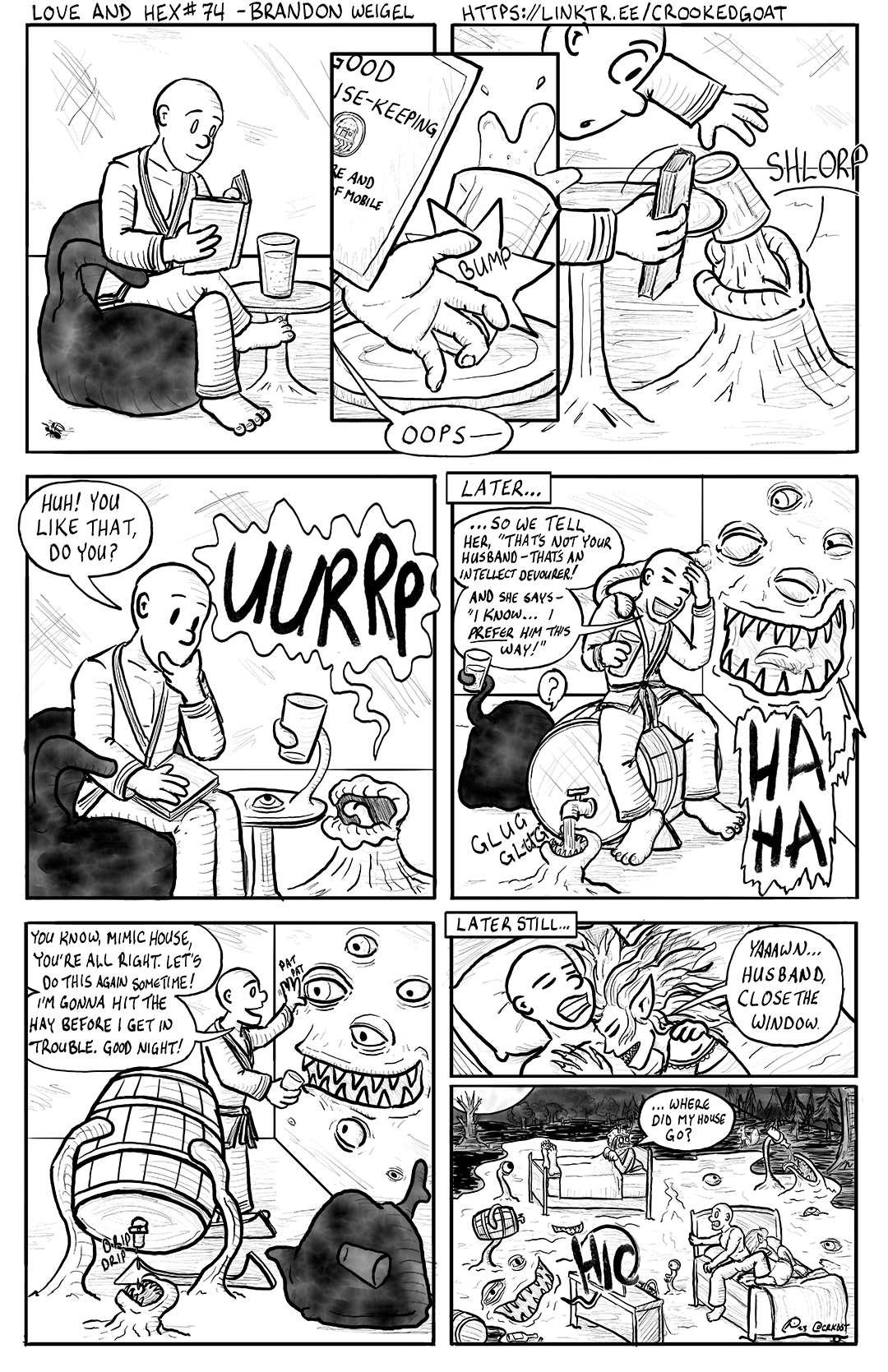 - Zoom out - the entire mimic house has collapsed into a drunken puddle. Mouths continue to drink from various bottles and barrels. Singing Cricket gets out of bed in a panic as Nanny Muk sites up in her bed and asks, "...Where did my house go?"