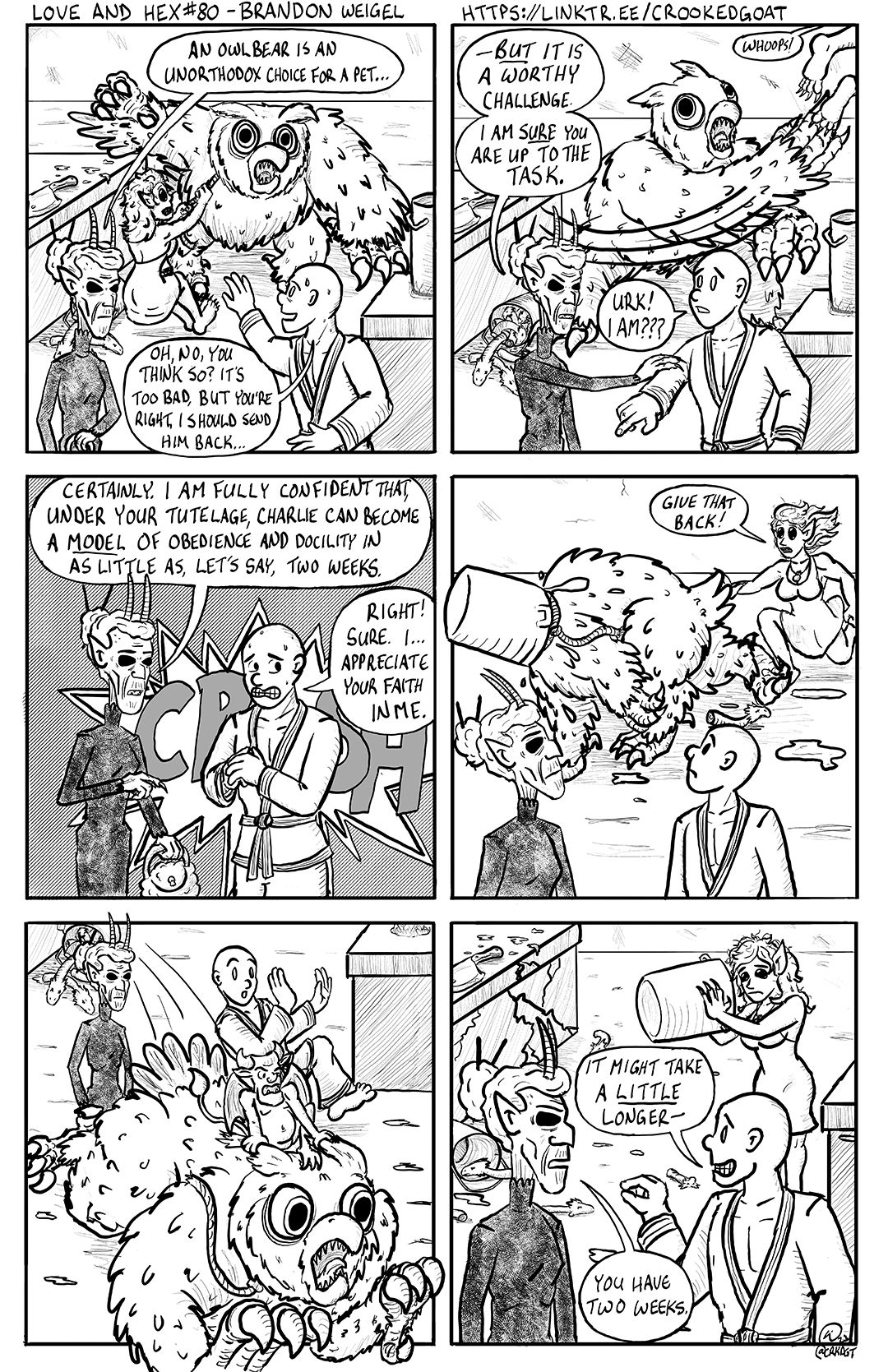 TranscriptIn the background, Charlie the owlbear looms over Kayra, who struggles to calm him down. In the foreground, Singing Cricket talks nervously with Granny Dismal. Granny Dismal: "An owlbear is an unorthodox choice for a pet..." Singing Cricket, looking relieved: "Oh, no, you think so? It's too bad, but you're right, I should send him back..." Charlie, on his back two legs, swipes his burly arm across the panel and sends Kayra flying out of the picture. A word balloon follows her: "Whoops!" Granny stops Singing Cricket from reaching for Charlie's rope: "--BUT it is a worthy challenge. I am SURE you are up to the task." SInging Cricket, looking unhappy: "Urk! I am???" Granny ignores the loud CRASH behind them, as Singing Cricket glances around and twiddles his fingers, ever more anxious. Granny: "Certainly. I am fully confident that, under your tutelage, Charlie can become a MODEL of obedience and docility in as little as, let's say, two weeks." Singing Cricket: "Right! Sure. I... appreciate your faith in me." Charlie runs past with the cooking pot on his head. Kayra is chasing after him, shouting, "Give that back!" Charlie runs between Granny and Singing Cricket, exploding out of the panel, with an angry imp tugging on his ear tufts trying to control him. Kayra looks sadly into her empty cooking pot, hydra heads scattered around the ruined kitchen. Singing Cricket, grinning hopefully: "It might take a LITTLE longer--" Granny Dismal: "You have two weeks." |