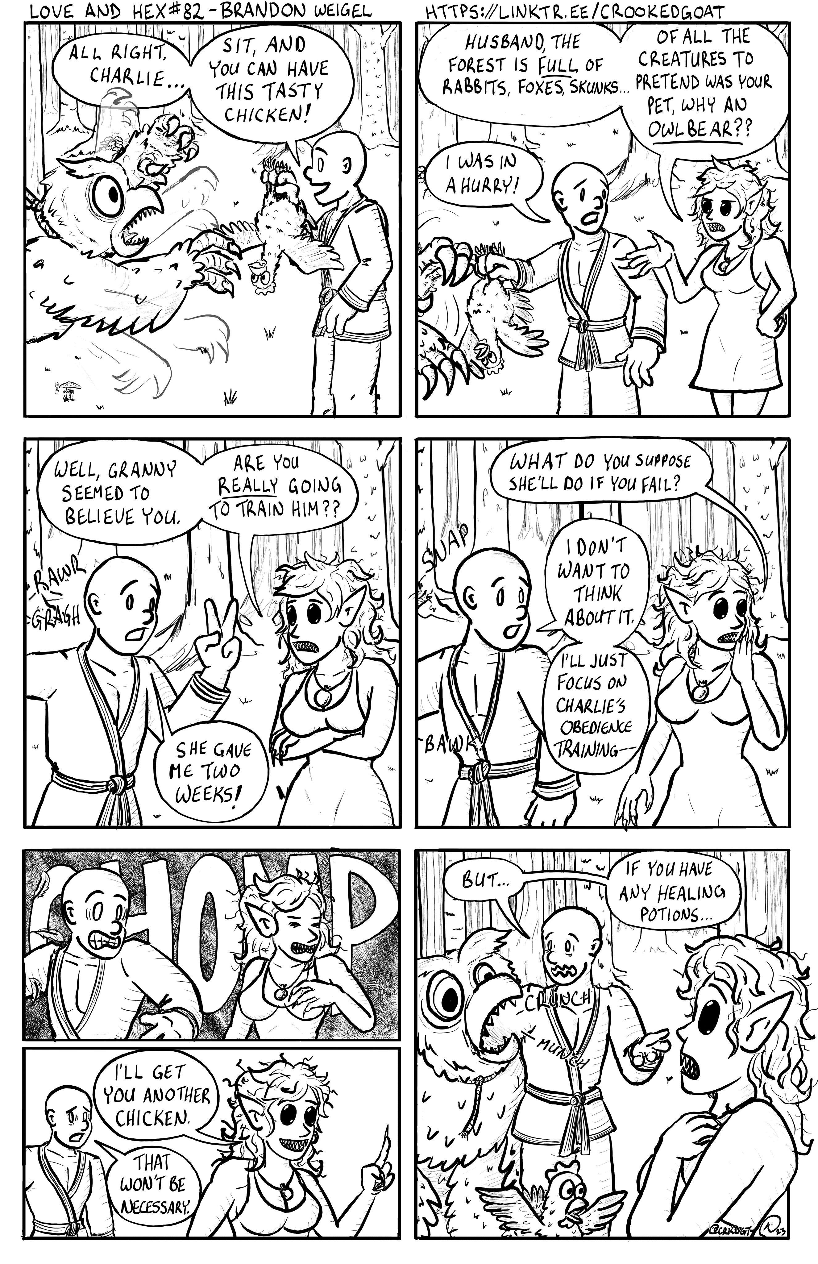 Kayra, looking annoyed: "Husband, the forest is FULL of rabbits, foxes, skunks... Of all the creatures to pretend was your pet, why an OWLBEAR?" Singing Cricket, looking despondent: "I was in a hurry!"