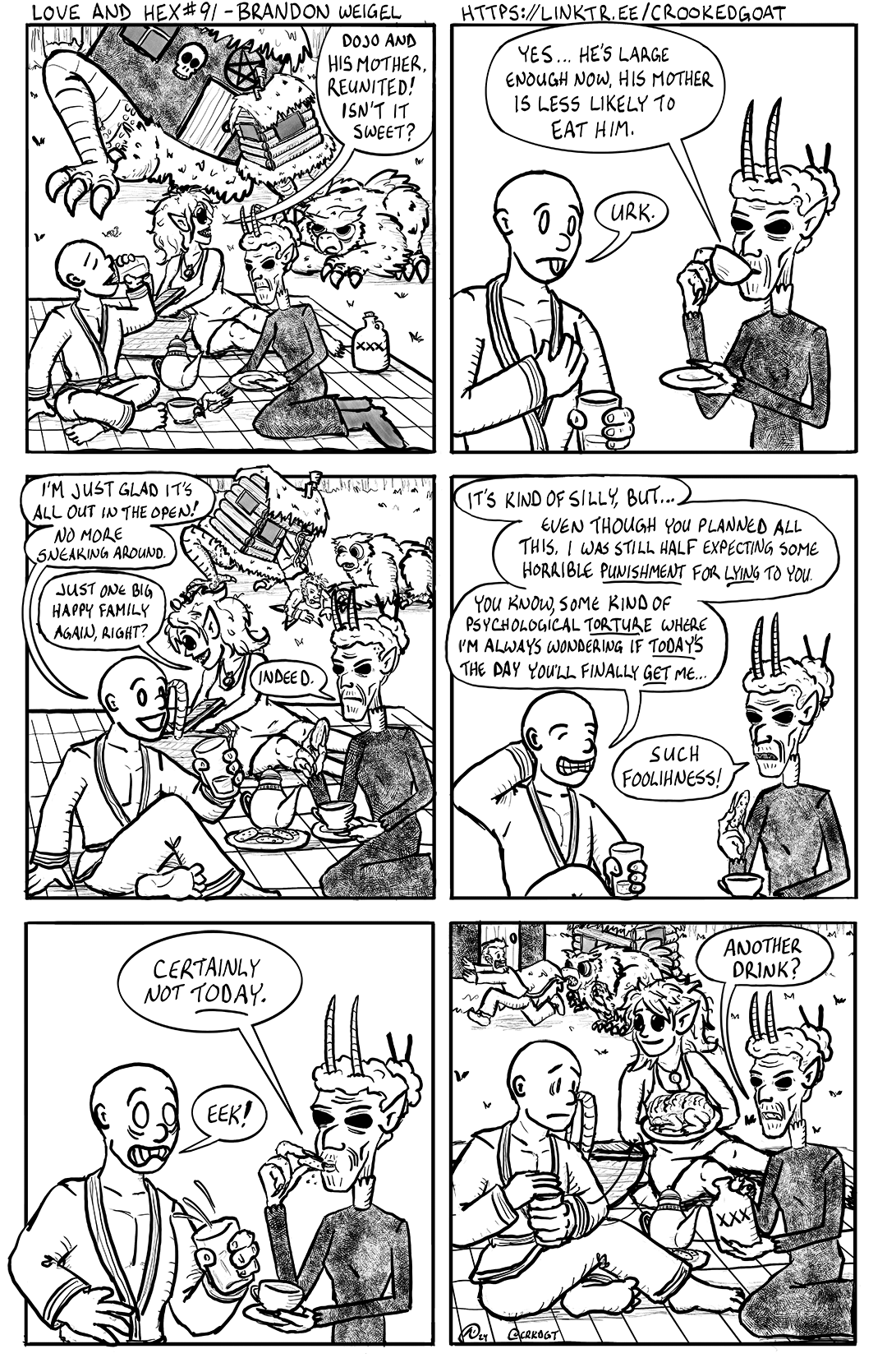 It’s the end of the House Training arc! A new arc featuring an old favourite character begins next episode, because I accidentally came up with a new storyline while skiing this weekend. There may be some Patron-only pages coming out of this.