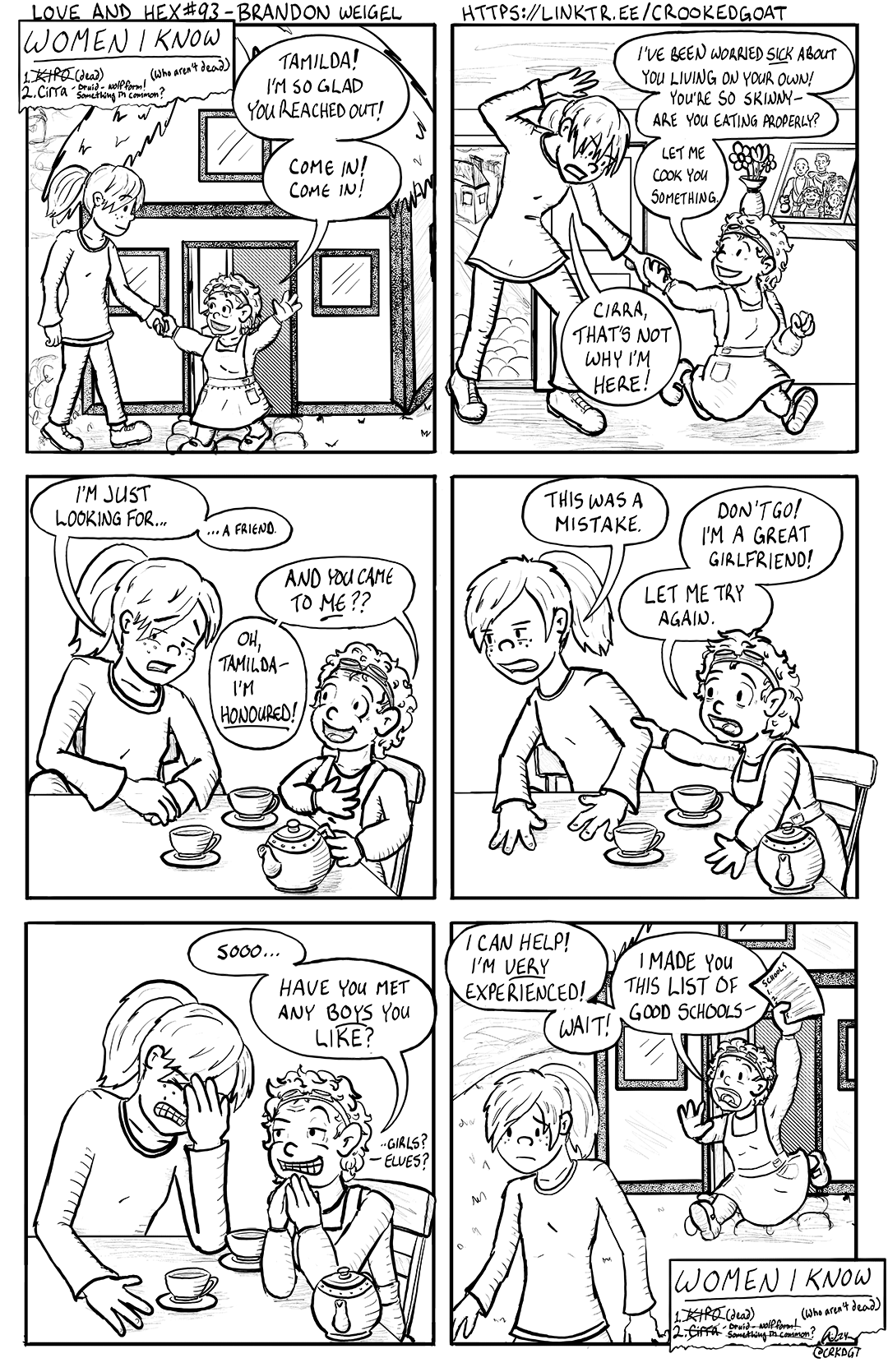 Cirra: "I've been worried sick about you living on your own! You're so skinny - are you eating properly? Let me cook you something." Tamilda glares in annoyance. "Cirra, that's not why I'm here!"