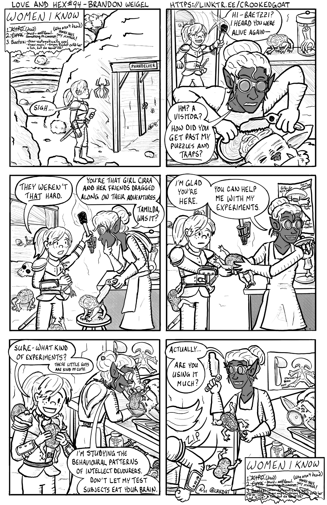 Baetzzi: "I'm glad you're here. You can help me with my experiments." Tamilda does not seem to notice the other intellect devourer crawling up her leg.