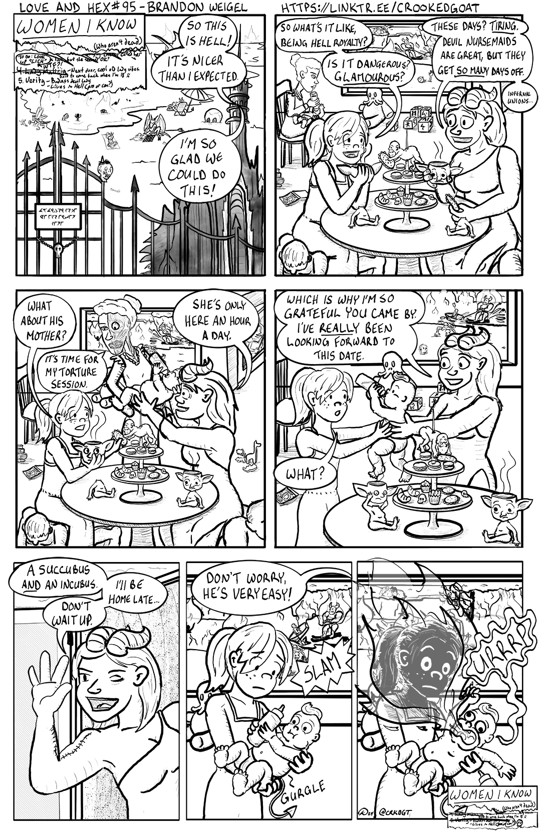 A crossed out entry for #4: "Lady Malicia - Next door, cool old lady vibes. Said to come back when I'm 18 :(" The latest, number 5, is still open: "Verity - Badass devil lady. - Lives in Hell (pro or con?) Word balloons come from the castle tower: TAMILDA: "So this is Hell! It's nicer than I expected." VERITY: "I'm so glad we could do this!"