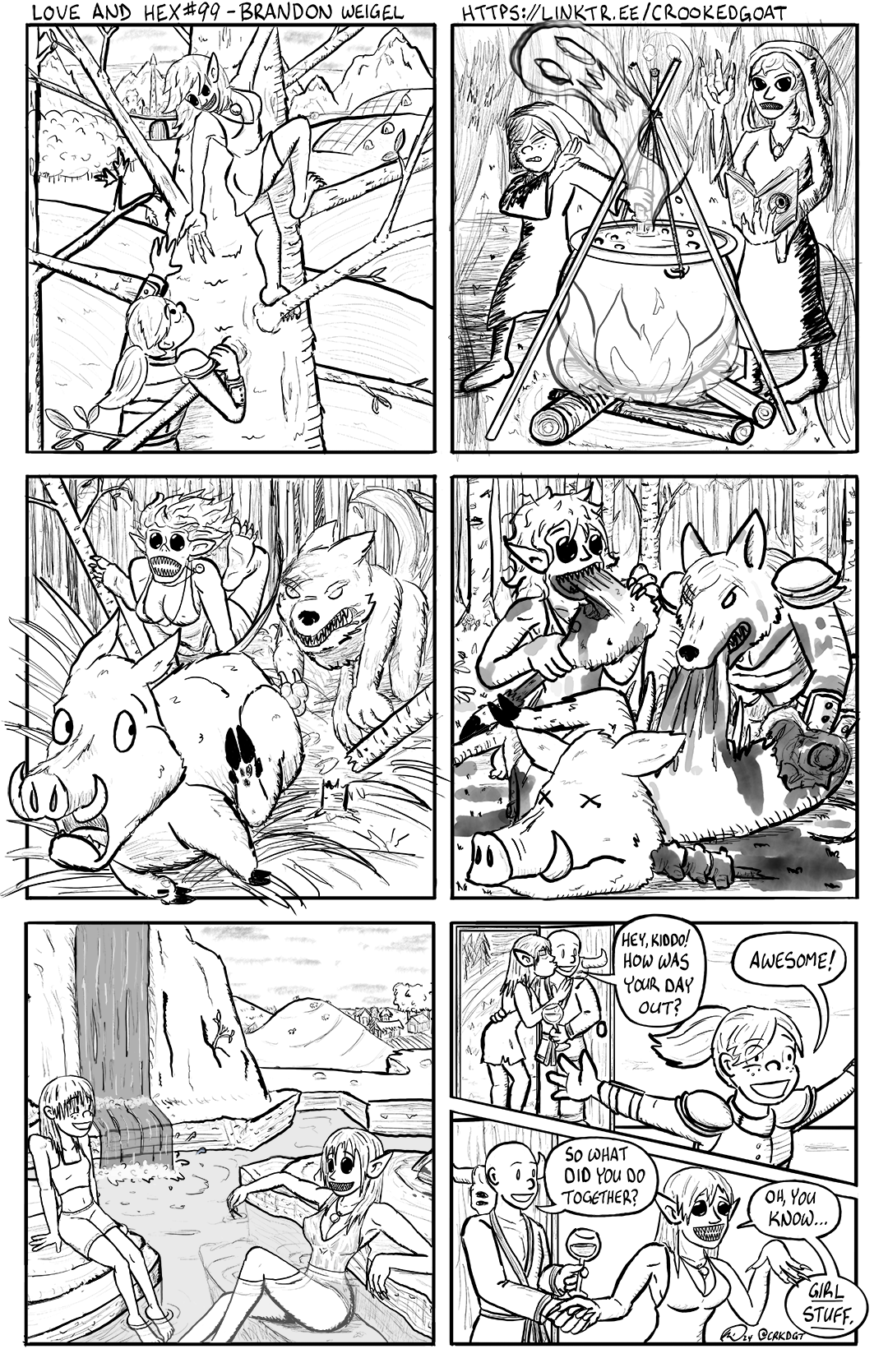 Tamilda, now in partial-wolf form, sits with Kayra in the corpse of the boar. The two of them feast on the raw, bloody meat.