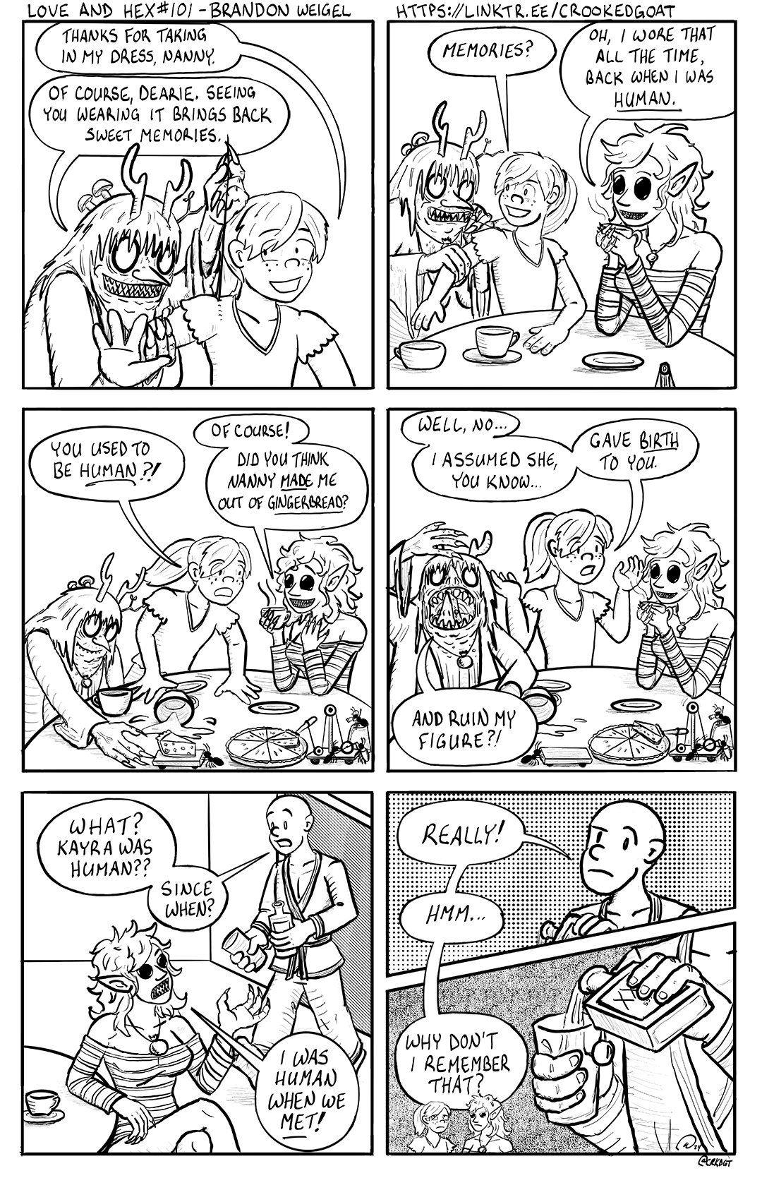 Tamilda: "You used to be HUMAN?!" Kayra, amused: "Of course! Did you think Nanny MADE me out of GINGERBREAD?" Meanwhile, Nanny Muk is reaching for a slice of pie, which is being brought to her by a complicated mechanism piloted by ants and beetles working together.