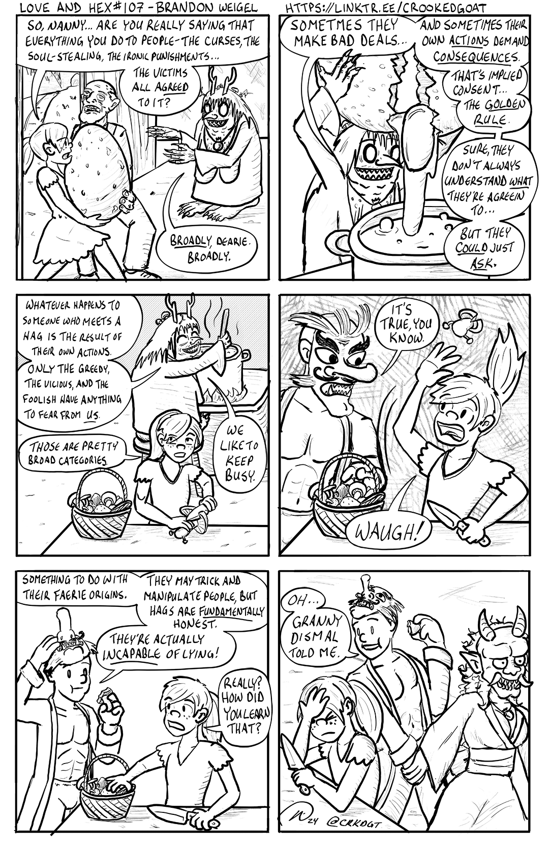 Singing Cricket: "Something to do with their Faerie origins. They may trick and manipulate people, but hags are FUNDAMENTALLY honest. They're actually INCAPABLE of lying!" Tamilda, reaching for another mushroom: "REally? How did you learn that?"