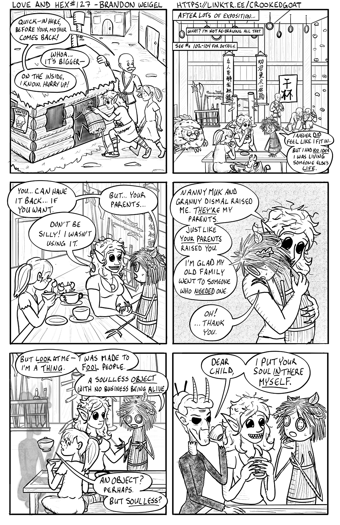 - Kayra and Changeling continue their conversation. Tamilda reacts in surprise as Granny Dismal fades into existence at the empty space at the table.