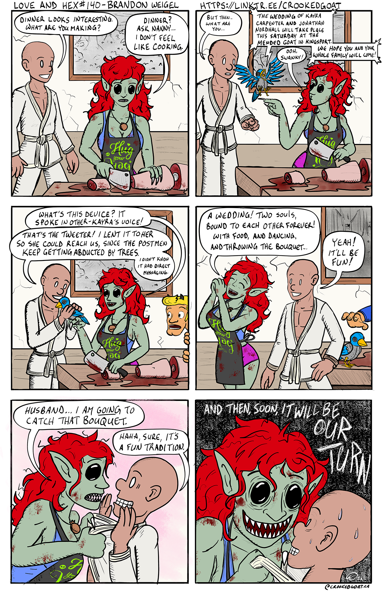 - Singing Cricket walks up to Kayra, who is wearing a "Hug Your Hag" apron and solumnly chopping up some sort of large hunk of meat. Blood splatters everywhere.