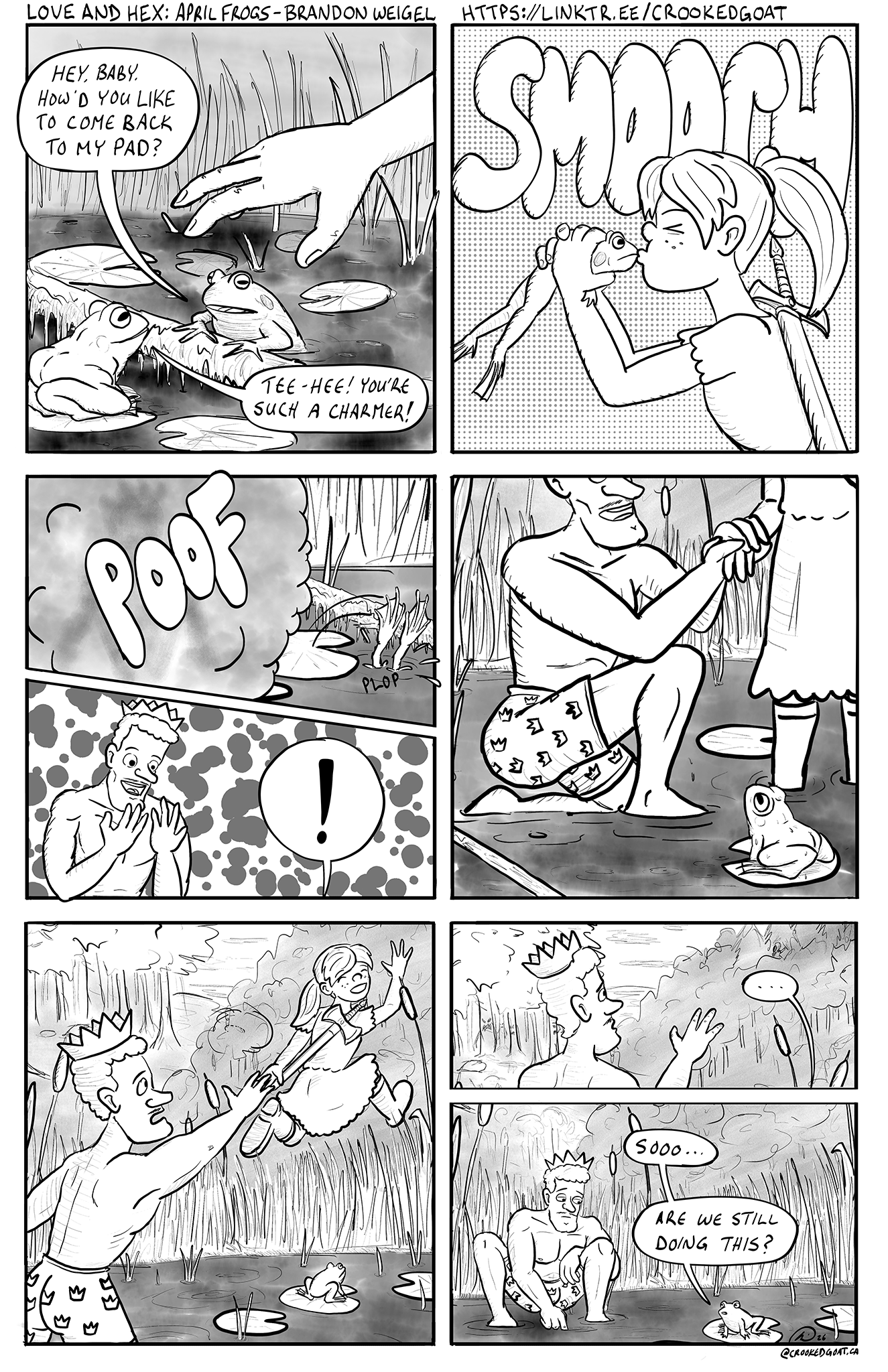 Frog 1 is now a Prince. He looks at his human hands in astonished delight. Frog 2, off panel, reacts with "!"