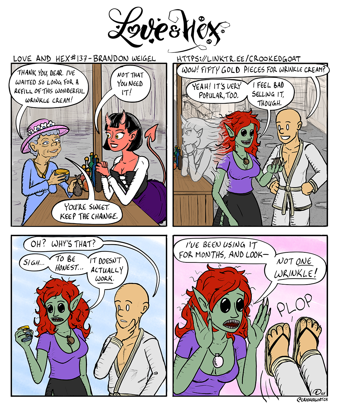 - Kayra, disguised as a cute, red-skinned, short-haired tiefling, leans over the counter of her potion stall. An elderly woman with a wrinkled face hands over a pouch of gold and clutches a jar of cream.